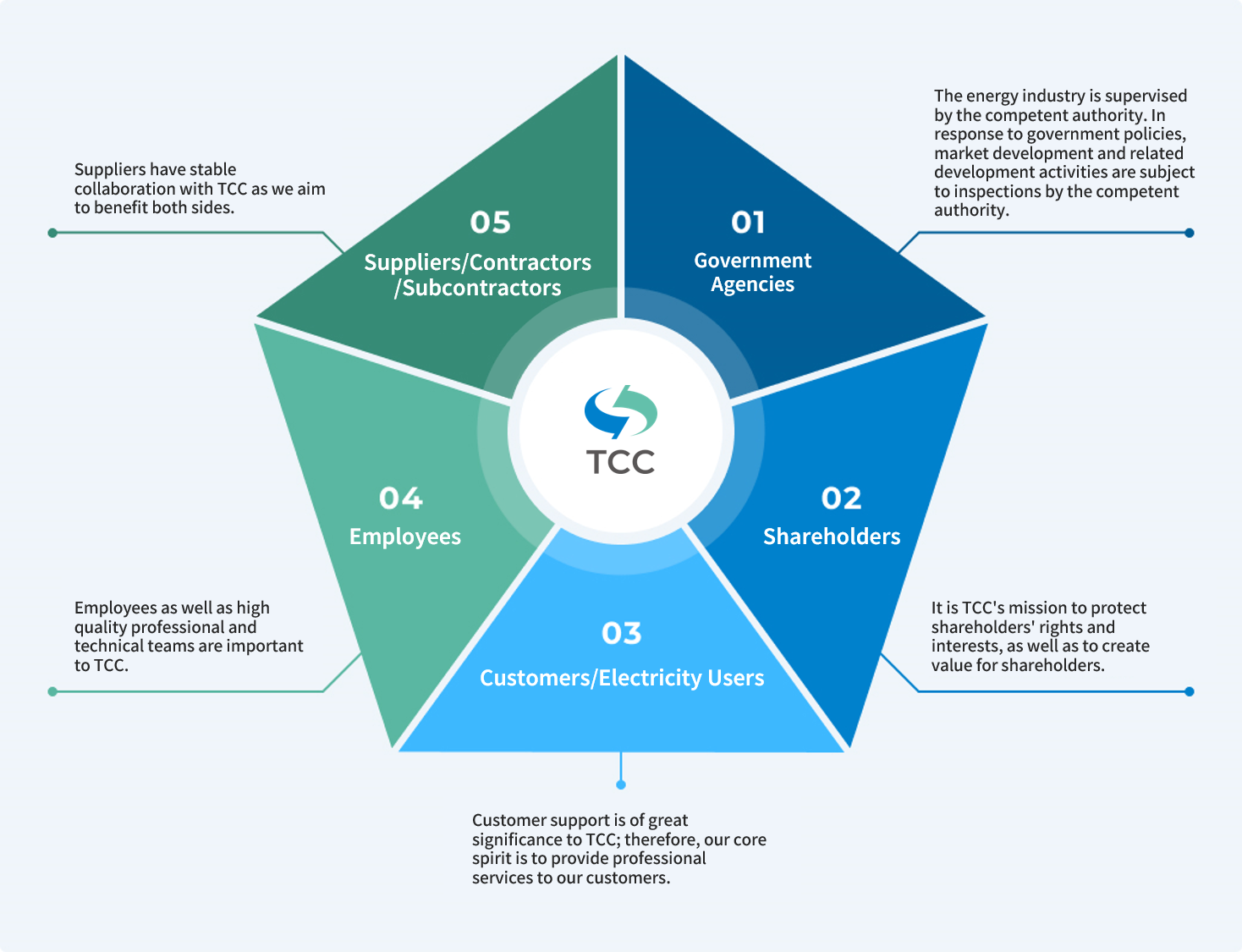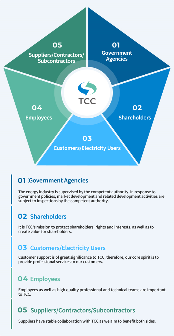 Five types of stakeholders, including government, shareholders, customers/electricity users, and employees to suppliers/contractors/ subcontractors, were identified. These five key stakeholders share a certain degree of impact on TCC's sustainable development. As a corporate citizen, TCC designates exclusive communication channels for each stakeholder. Adopting substantive analysis, the most important topics for stakeholders and TCC are identified. Subsequently, necessary measures are implemented to strengthen the content of information disclosure, serving as the basis for sustainable development.