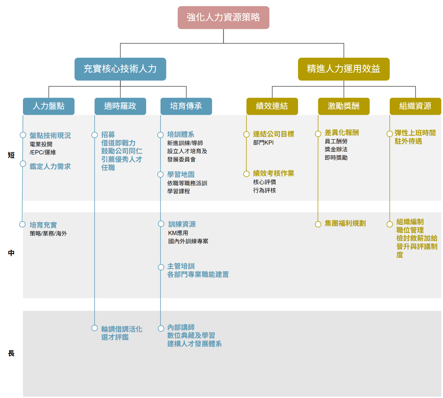 台汽電秉持員工為企業最重要資產之信念,制訂與公司經營策略相連結的人才培育計畫,建構系統性人力資源策略與規劃,依職務所需專業提供訓練課程,強化人力資源管理,短中長期規劃如下圖。