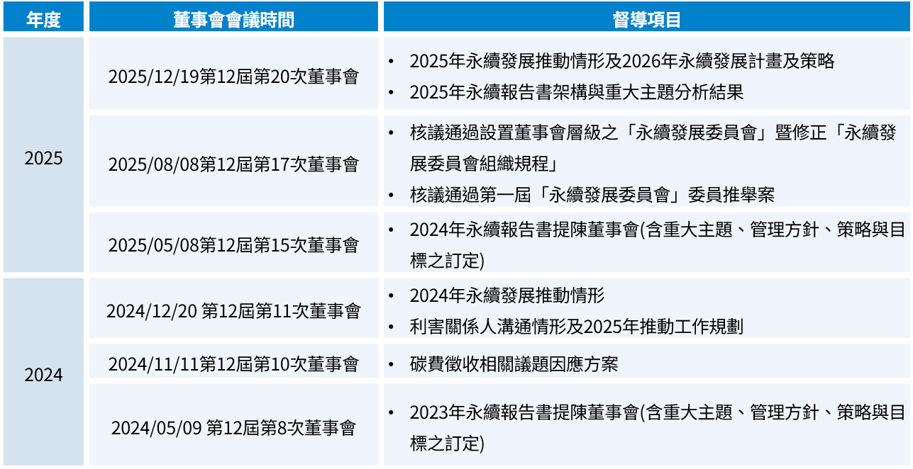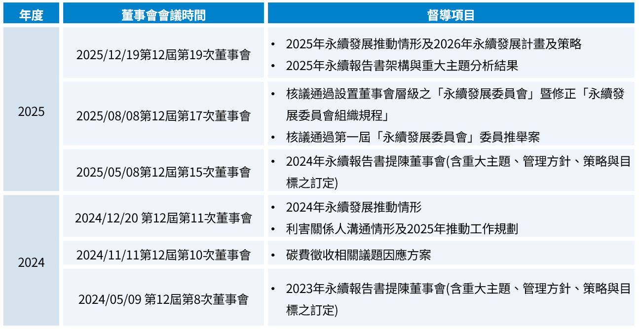 於2025/12/19董事會報告該年度永續發展推動情形、利害關係人溝通情形、2026年永續發展計畫及策略,以及2025年永續報告書架構與重大主題分析結果