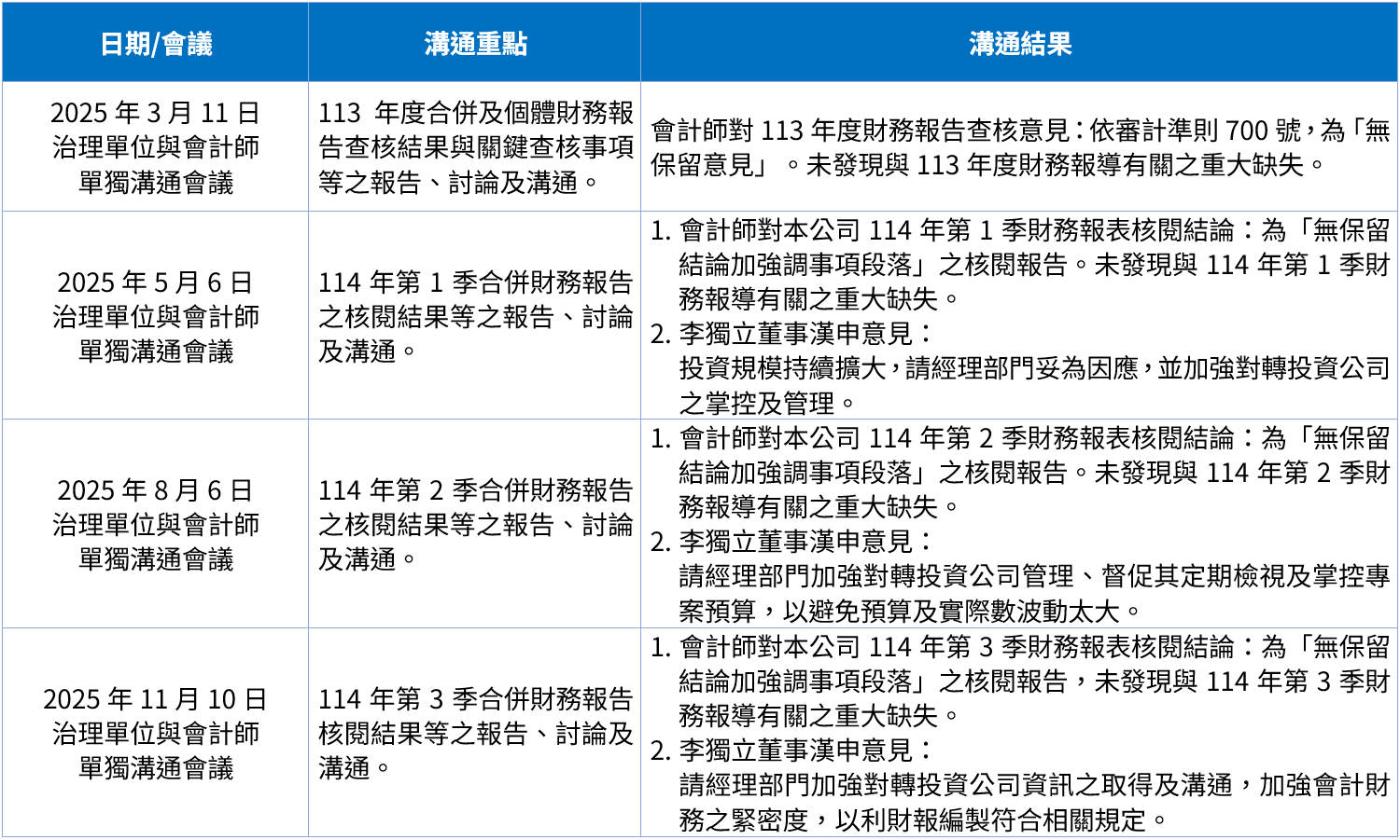 - 本公司簽證會計師於財報出具前與獨立董事進行溝通會議,就財務報告核閱或查核結果及內控查核情形進行報告,及針對最新法令修訂有無影響帳列情形進行溝通及討論。 另向獨董報告年度財務報表之查核規劃。
