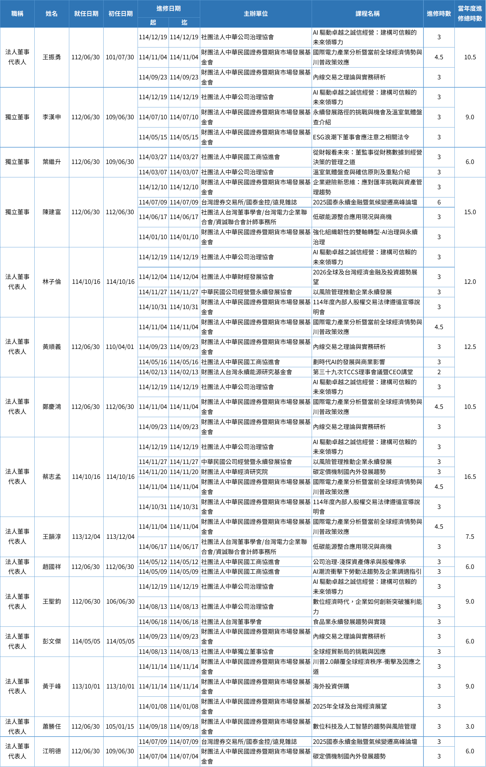 第12屆董事2025年進修情形如下(截至12月31日止):