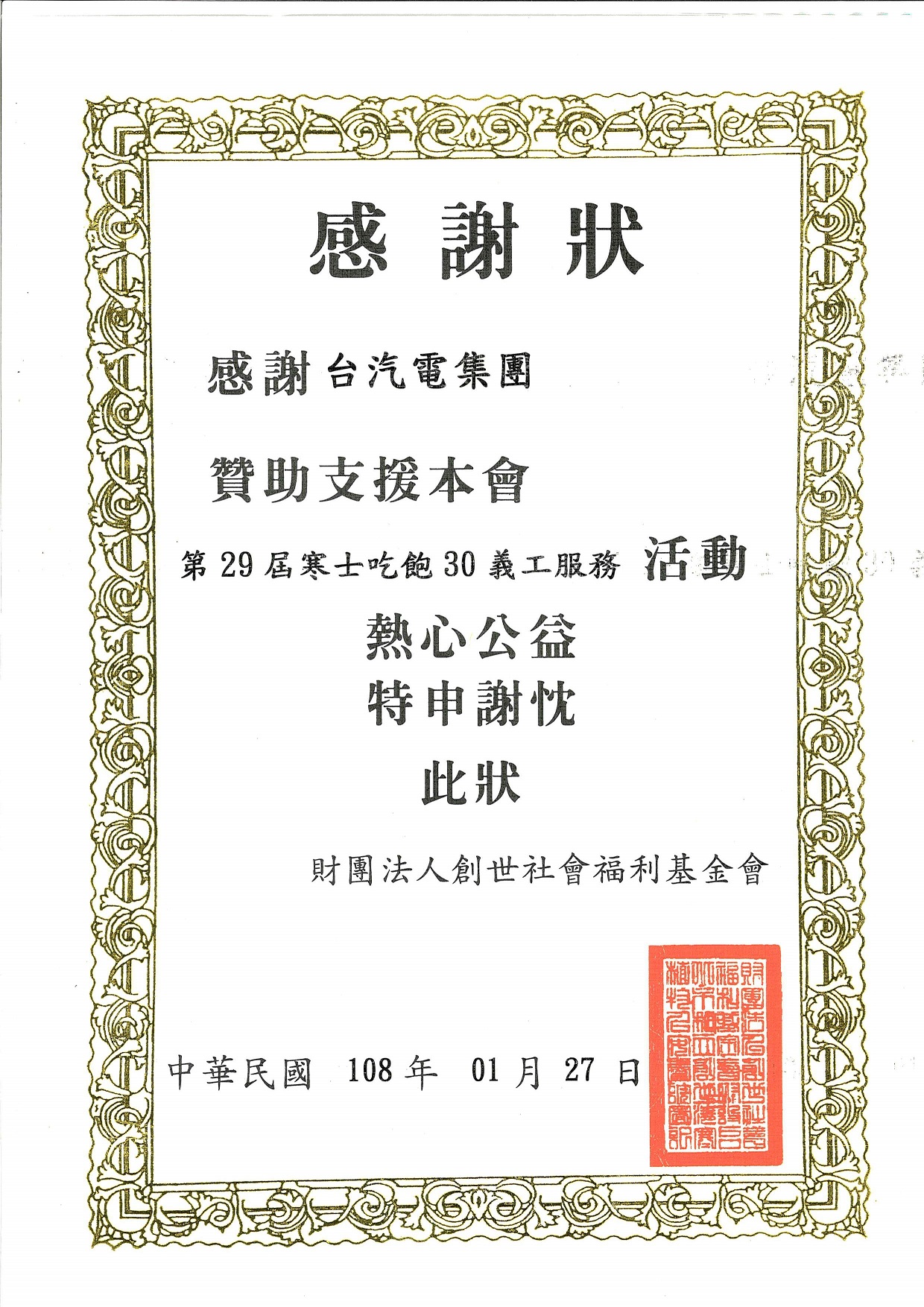 為實踐本公司關懷弱勢之理念,參與由創世、華山、人安基金會策略聯盟共同舉辦的「箸福植物人雙軌服務暨寒士尾牙活動」,台汽電志工同仁們一起擔任端菜天使,在寒冬中為寒士、街友、獨居長輩及單親媽媽送上一道道佳餚。